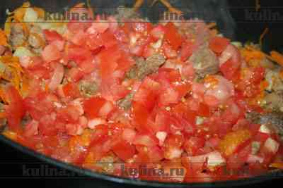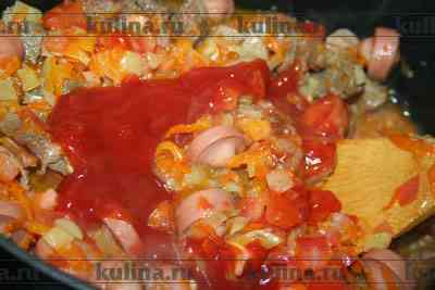 Добавить к овощам и мясу томатную пасту или кетчуп, все хорошенько перемешать, влить 1/2-3/4 стакана кипяченой воды, закрыть крышкой и потушить овощи с мясом.