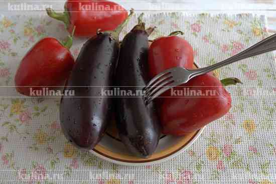 Прокалываем баклажаны и паприку в нескольких местах и отправляем в духовку, разогретую до 180° C на 30-40 минут.