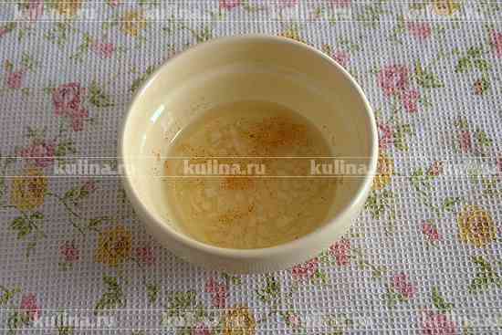 Делаем заливку из масла, чеснока и других специй, для чего соединяем в миске масло, мелко нарезанный чеснок и чили.