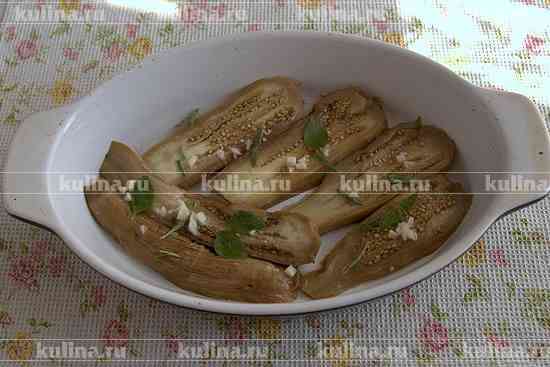 Нарезаем баклажаны пластинами, толщиной до 1 см и выкладываем их часть на форму.