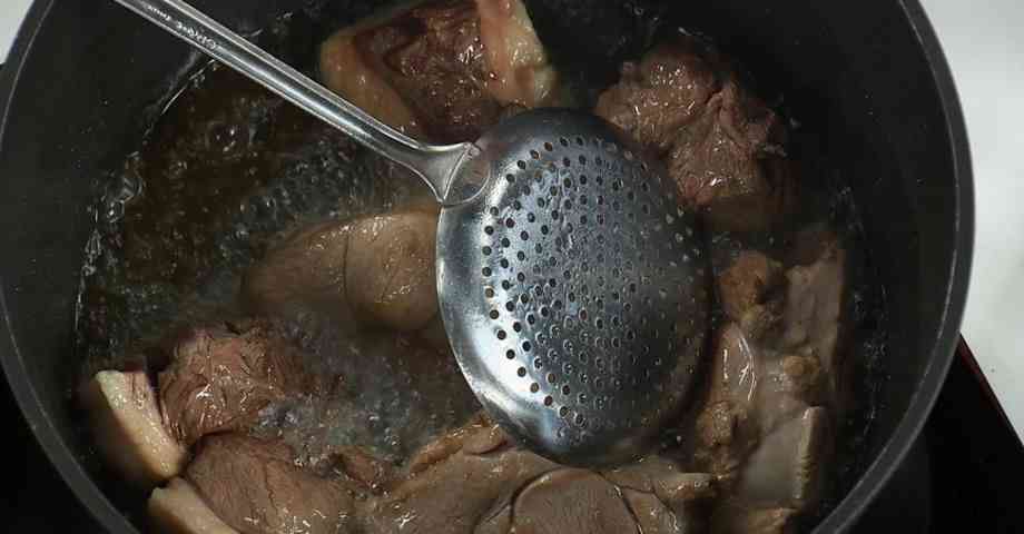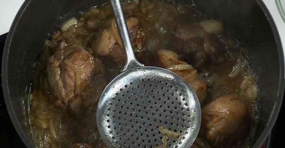 Когда лук обжарится, вливаем воду. Она должна покрывать мясо. Доводим до кипения, убавляем огонь. Даем протушиться.
