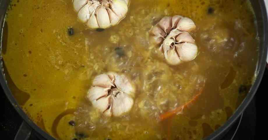 Очищаем верхний слой чешуи с головок чеснока. Добавляем в плов. Накрываем крышкой.