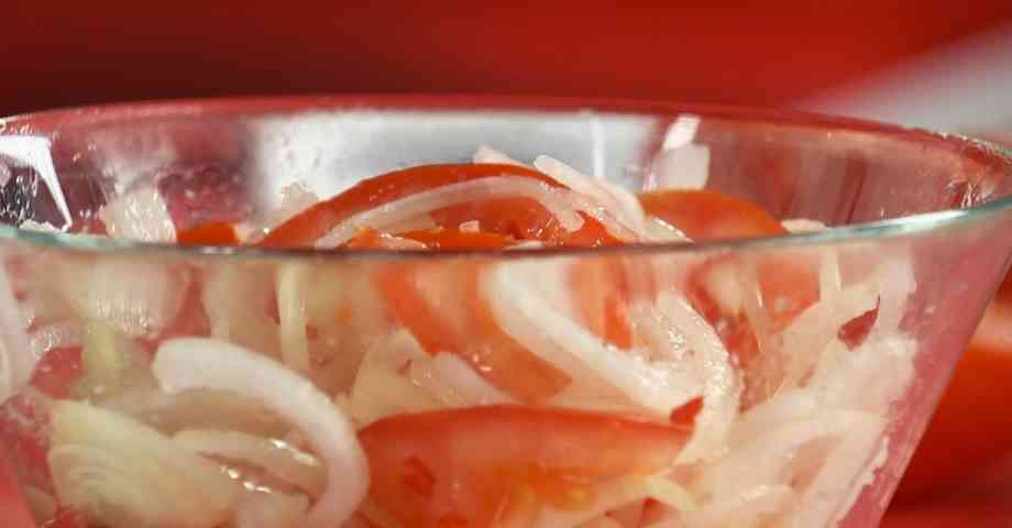 Готовим салаты к плову. Первый салат Аччик-чучук. Удаляем плодоножки у помидоров. Тонко нарезаем помидоры. Измельчаем перец чили.