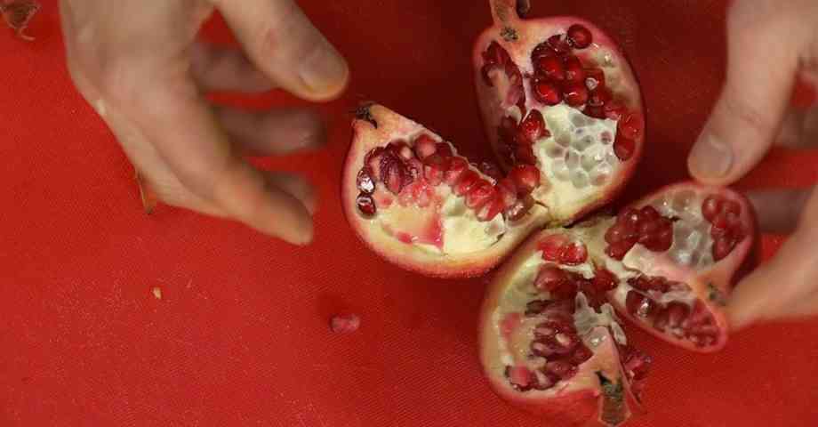Надрезаем гранат. Раскрываем. Соскребаем зерна в миску.