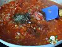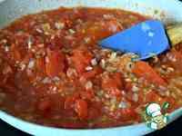 Добавить в сковороду томаты в собственном соку, предварительно размять их вилкой. Потушить соус минут пять на среднем огне.