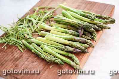 Молодую спаржу подготовить к бланшированию. Сначала надо отрезать подсохшее основание побегов (в зависимости от срока и возраста спаржи