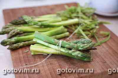 Собрать спаржу в небольшие пучки и связать кулинарной нитью. Довести воду до кипения, хорошо посолить, уменьшить огонь и положить