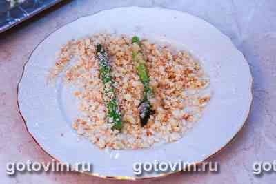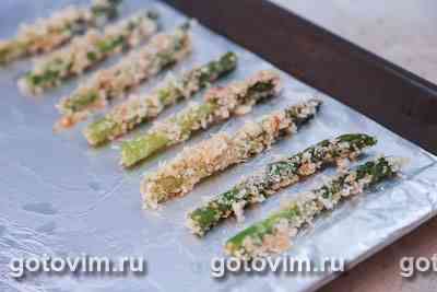 Хорошенько обвалять спаржу в крошках и переложить на противень.