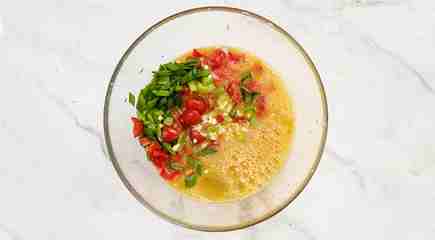 Взбейте яичную массу венчиком до однородности. Добавьте подготовленные овощи и перемешайте.