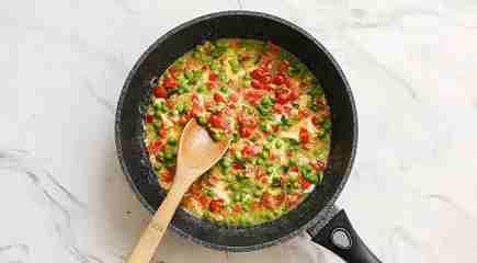3 мин. Когда нижняя часть схватится, перемешайте омлет лопаткой, чтобы он распался на мелкие кусочки. Продолжайте готовить еще 2 мин.