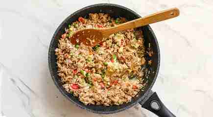 Жареный рис по-китайски можно отведать во всех азиатских ресторанах. Рецепт блюда очень прост, а состав так грамотно сбалансирован, что одна порция блюда даст вам необходимый запас энергии на весь день! Для легкого ужина этот рис жареный с яйцом тоже отлично подходит — после него не будет никакой тяжести в желудке. Готовьте блюдо в тяжелой сковородке с высокими бортиками и перемешивайте лопаткой до тех пор, пока яйца не поджарятся. Но не старайтесь сильно их разломать — вкус будет интереснее, если в нем будут встречаться достаточно крупные кусочки омлета.