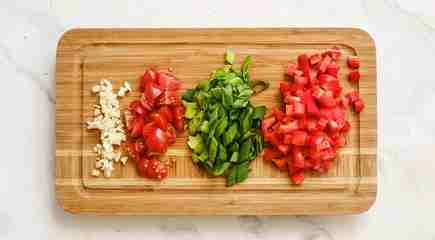мелкими кубиками. Помидор нарежьте такими же кубиками. Зеленый лук порубите кусочками длиной 1 см. Измельчите чеснок.