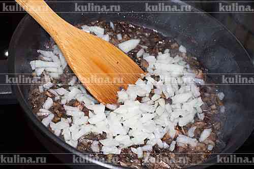Репчатый лук мелко нарезать и отправить к грибам.
