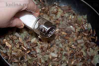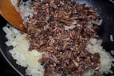 Разогреть растительное масло и обжарить лук с грибами.