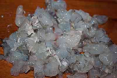 Отложить креветки для украшения, остальные мелко нарезать.