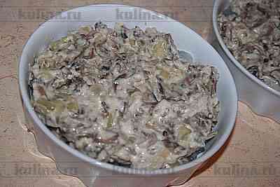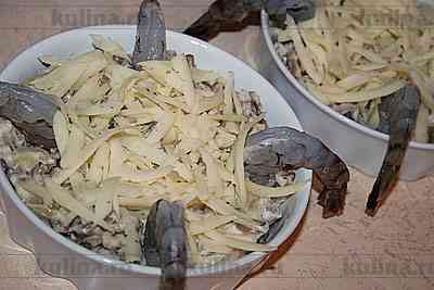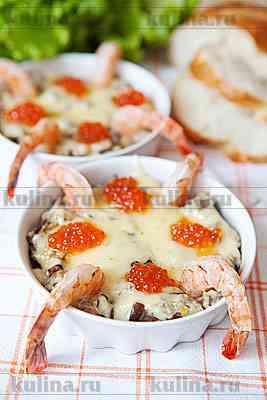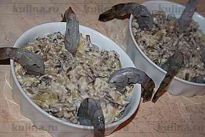 На креветки выложить грибную массу.