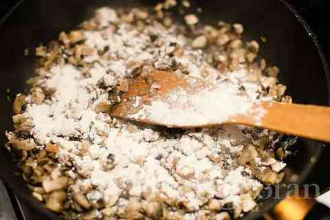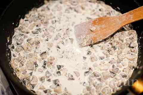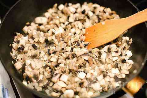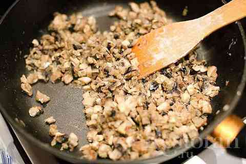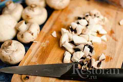 Отправляем грибы к луку и жарим до золотистого цвета. Если шампиньоны дадут воду, обязательно дождитесь, когда она выпарится. Солим.