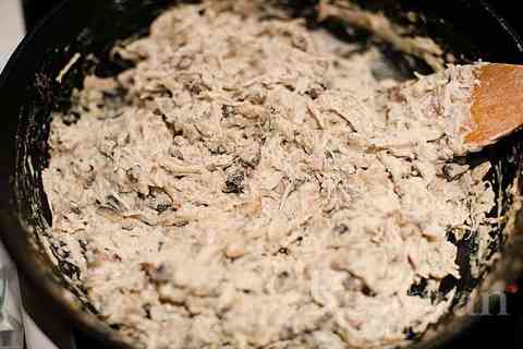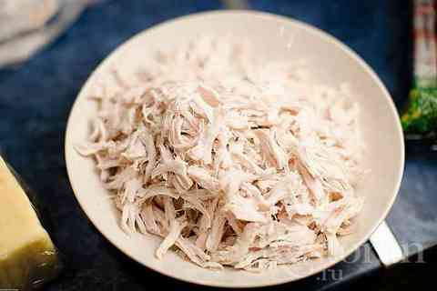Куриное филе отвариваем на среднем огне в течении 20 минут. В процессе варки добавим перец горошком и посолим. Затем даем остыть и разбираем руками на тонкие волокна.