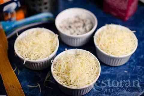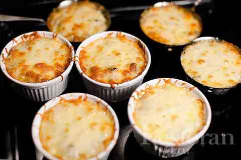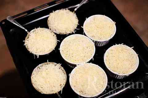 Раскладываем грибы с курой по кокотницам (формочкам) и посыпаем каждую сыром. У меня в этот раз получилось 7 штук.
