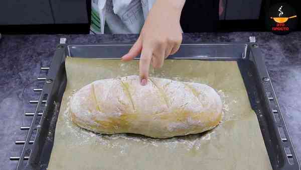 Хорошо присыпаем заготовку мукой со всех сторон. На тесте делаем надрезы с помощью острого тонкого ножа.