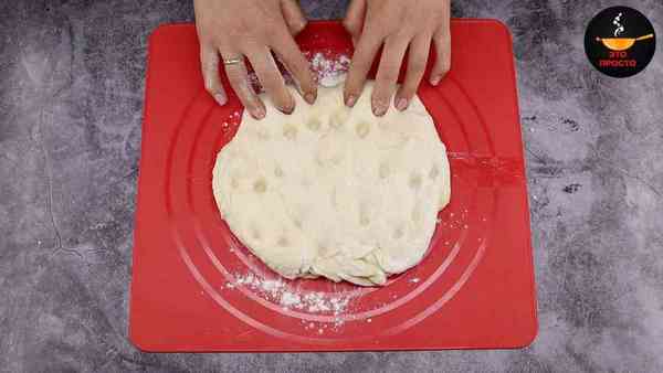 Противень застилаем пергаментом, присыпаем мукой, перекладываем на него тесто, накрываем тонким полотенцем и даём «отдохнуть» ещё минут 20.