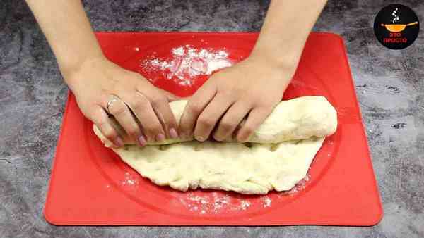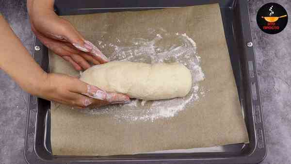 Снова растягиваем тесто в пласт и закручиваем в рулет, придавая форму батона.
