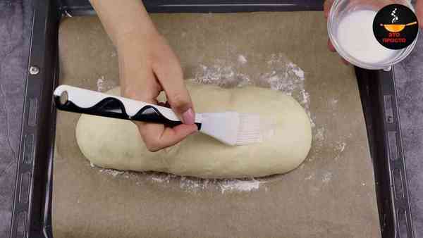 Теперь будущий батон смазываем сверху молоком. Молоко должно быть или комнатной температуры, или слегка тёплым.
