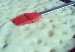 Сверху, пальцами руки, сделать небольшие углубления. Смешать оставшееся масло с 2 ложками воды и смазать кисточкой поверхность фокаччи.