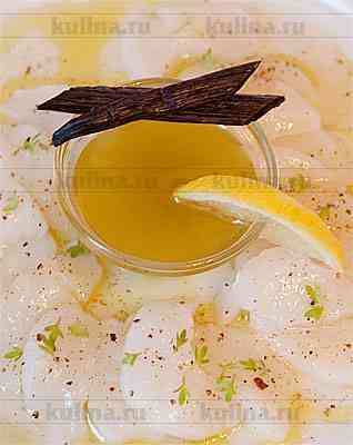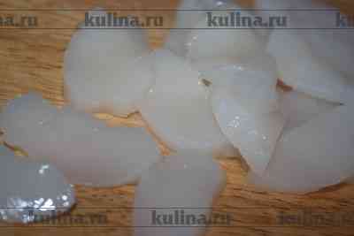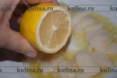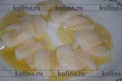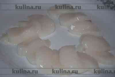 Гребешки вымыть, обсушить. Поместить на 30 минут в холодильную камеру. нарезать гребешки тонкими пластинами.
