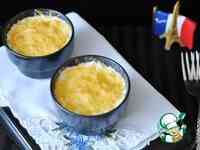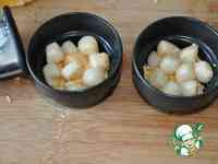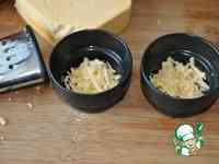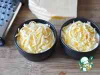 Берём кокотницы, у меня рамекины, на дно кладём половину количества тёртого твёрдого сыра.