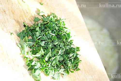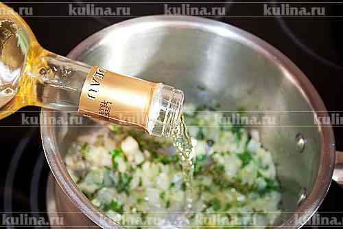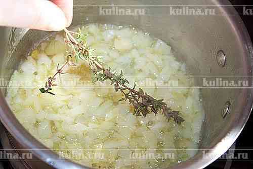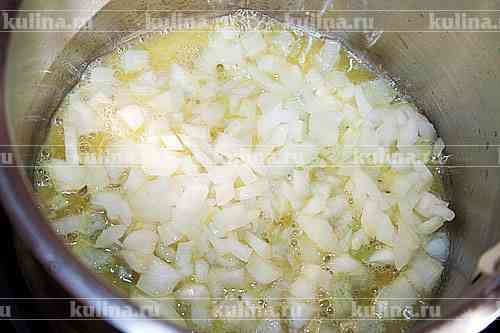 В сотейнике разогреть 70 г сливочного масла. Лук нарезать мелким кубиком и положить в сотейник, слегка обжарить.