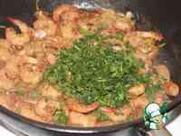 а нам нужны нежные сочные креветки. Засыпаем зелень, томим еще буквально пару минут.