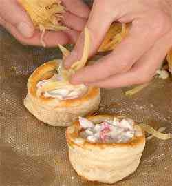 Наполнить получившиеся формочки крабами в соусе, присыпать тертым сыром и вернуть в духовку на 4 мин.