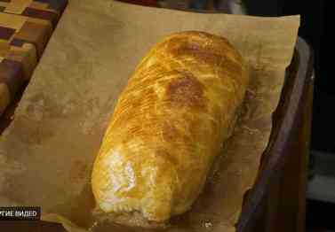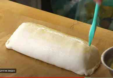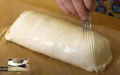 Лишнее тесто отрезаем и делаем сверху рулета неглубокие насечки. Биф Веллингтон отправляем в разогретую до 180° C духовку