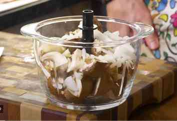 Приступим к приготовлению дюкселя. В куттер отправляем нарезанные грибы, половинку луковицы, зубчик чеснока и все измельчаем.