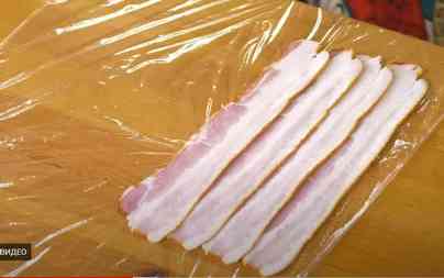 На столе расстилаем пищевую пленку и выкладываем на нее слайсы бекона таким образом, чтобы ими можно было чуть позже обернуть вырезку.
