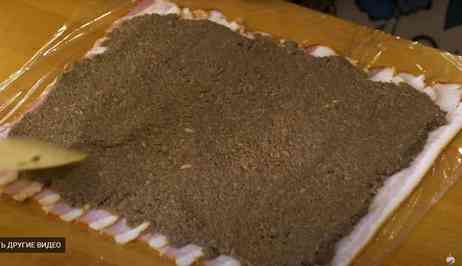 На бекон тонким слоем равномерно выкладываем дюксель.
