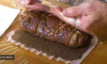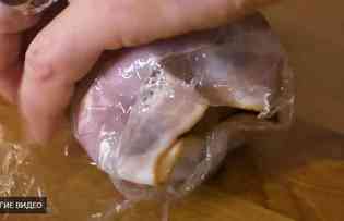 Бекон по краям рулета заворачиваем вовнутрь и все плотно заворачиваем в пищевую пленку. Рулет отправляем на некоторое время в холодильник.