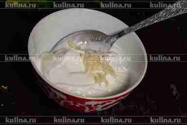 Йогурт вылить в миску, добавить измельченный чеснок.