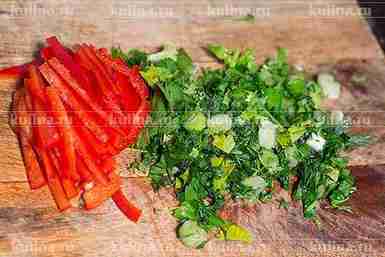 Сладкий перец очистить, нарезать соломкой. Зелень мелко нарезать.