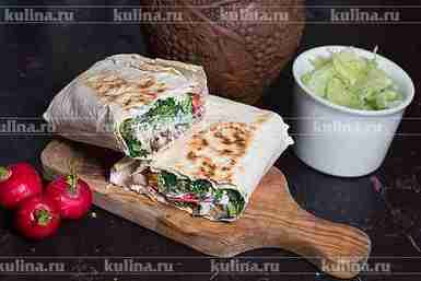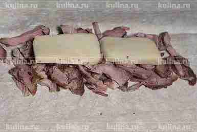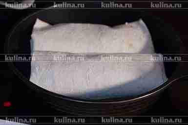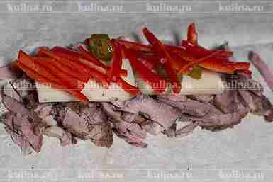 Расстелить лист лаваша, выложить мясо.