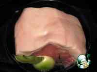 Окорок положить в жаропрочную кастрюлю и наполовину залить маринадом.