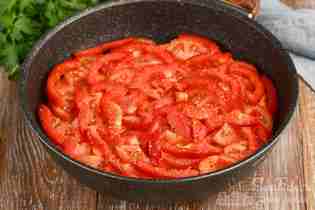 ломтики помидоров и соломка сладкого перца. Немного солим, перчим и вливаем воду.