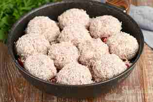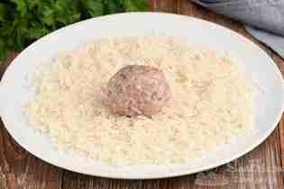 Из фарша формуем шарики (11 шт.) и обваливаем их в рисе, слегка прижимая.