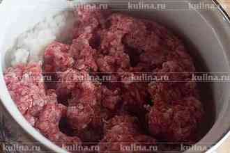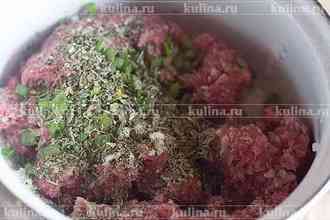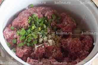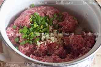 Зеленый лук и чеснок мелко нарезать, положить в миску к фаршу.