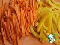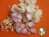 Помидоры заливаем кипятком, через пару минут достаем их и снимаем кожицу. Режем крупными дольками. Лук, чеснок, перец и морковь пассеруем