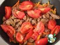 К овощам кладем мясо и помидоры, вливаем мясной бульон, который образовался при тушении говядины. Накрываем крышкой и тушим 20-25 минут.