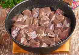 У говяжьей печени удаляем пленку, нарезаем на средние куски, заливаем молоком и оставляем на столе на 2 часа. Молоко улучшает вкус и делает печень нежнее.