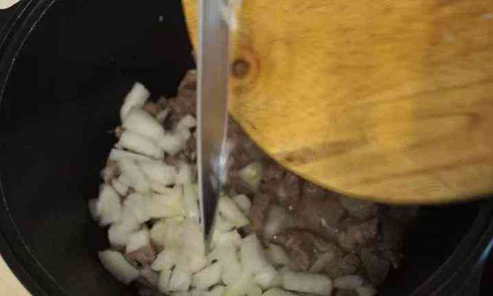 Мясо нарезаем небольшими кусочками, репчатый лук мелко порежем. В казан, или кастрюлю с толстым дном, наливаем немного