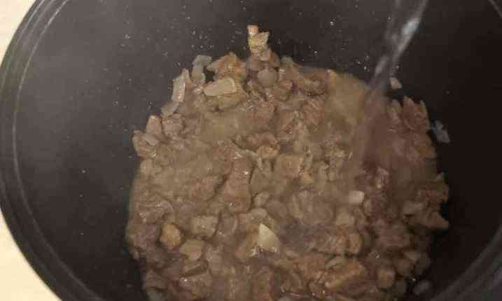 Жидкость испарилась, теперь добавляем воду, так чтобы мясо было покрыто полностью. Закрываем казан крышкой и тушим до